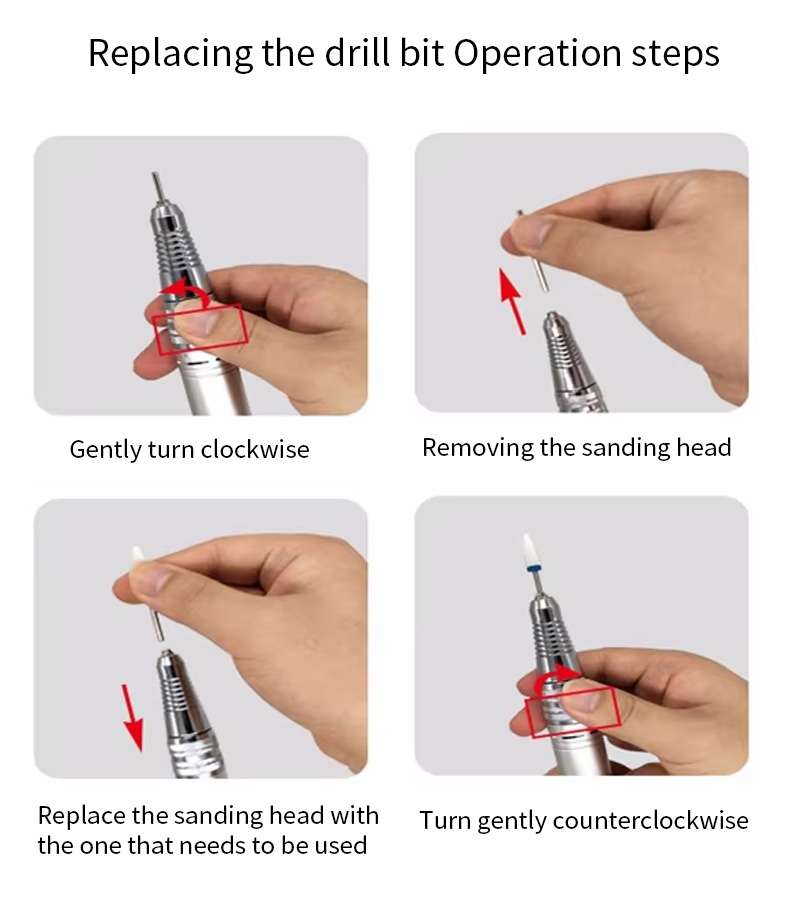 Această metodă de operare a burghiului electric de înlocuire a burghiului pentru unghii de 30.000 de rpm, adică conectarea și extragerea, ușor și convenabil, înlocuirea poate fi utilizată după finalizare.