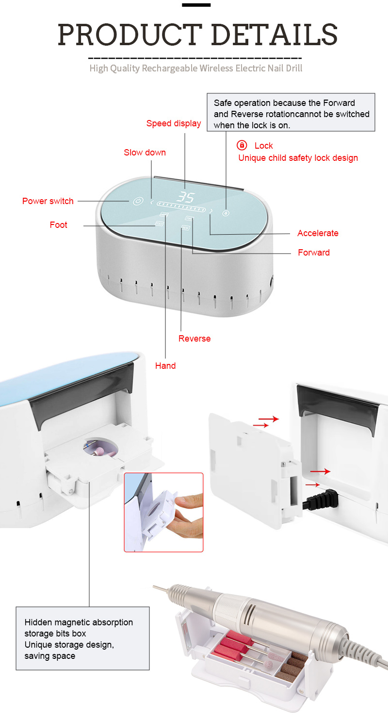 Caracteristici și aplicații ale produsului celor 217 de 217 de mare viteză de 35000 rpm fișier electric de unghii pentru îndepărtarea lacului