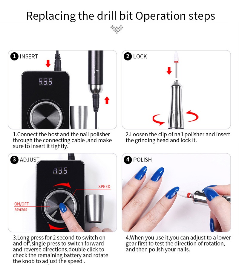 Această metodă de operare a burghiului electric de înlocuire a burghiului pentru unghii de 35.000 de rotații pe minut, adică conectați și scoateți, ușor și convenabil, înlocuirea poate fi utilizată după finalizare.
