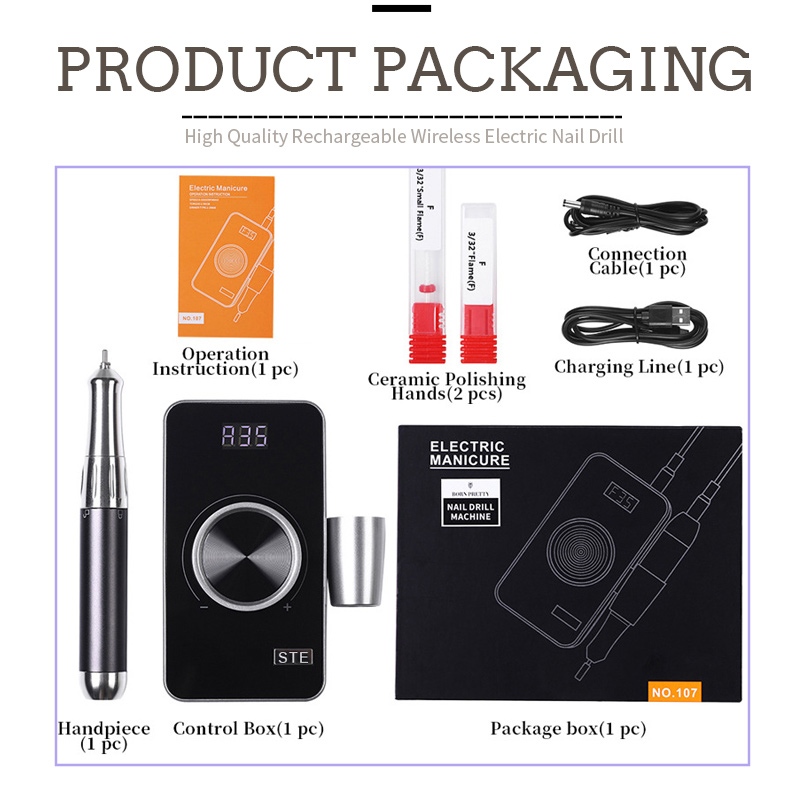 Conținutul acestui pachet de găurit electric pentru unghii de 35.000 rpm are un produs stilou de șlefuit, un cablu de încărcare USB, un manual de instrucțiuni pentru produs și o cutie ușoară și portabilă.