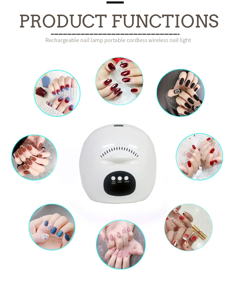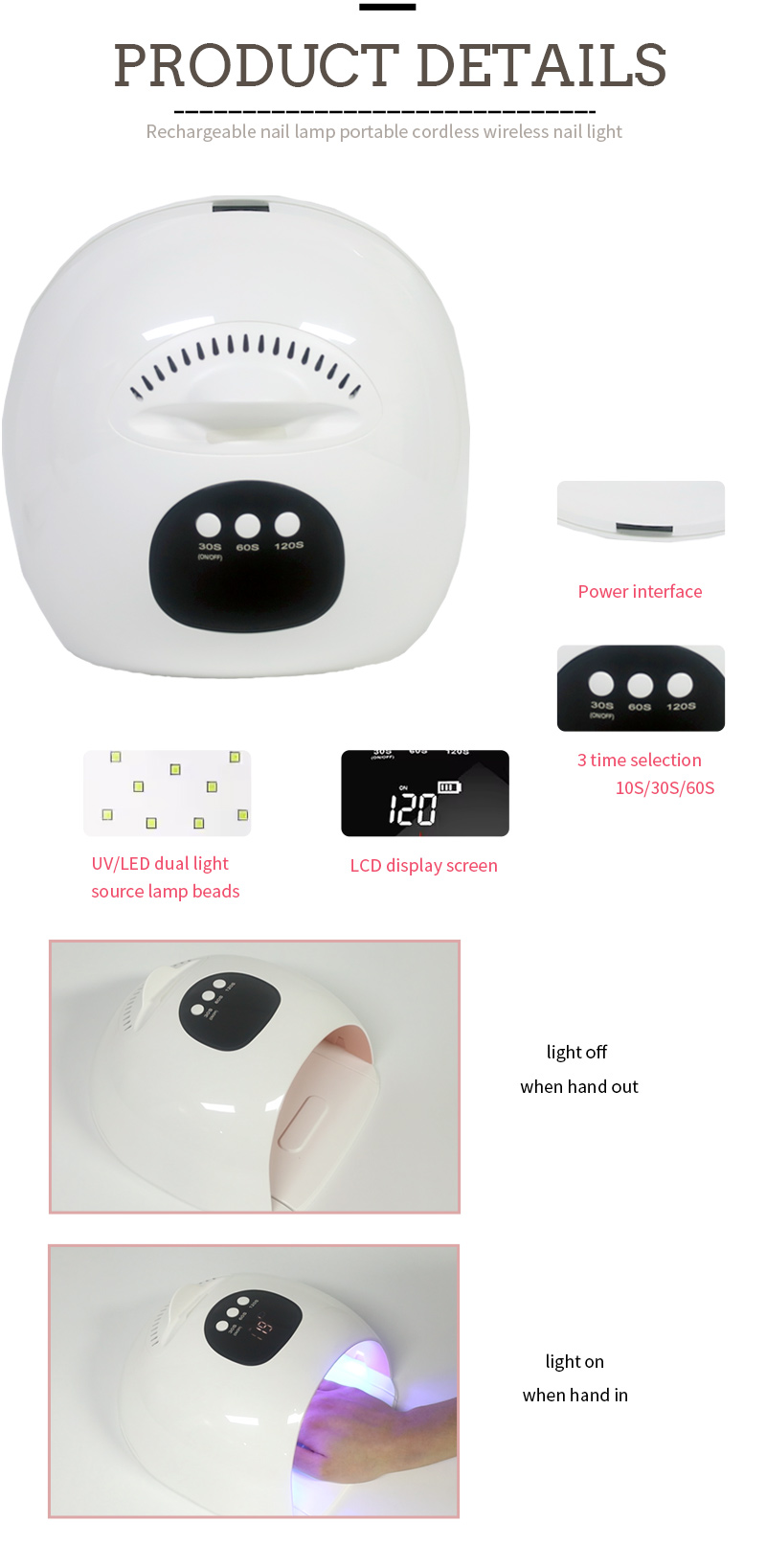 Produsul asigură o uscare uniformă a adezivului fără contracție. Sursele sale de lumină duale asigură o încălzire blândă pentru a preveni decolorarea mâinilor și oboseala ochilor, potrivite atât pentru mâini, cât și pentru picioare, oferind rezultate de uscare remarcabil de rapidă.