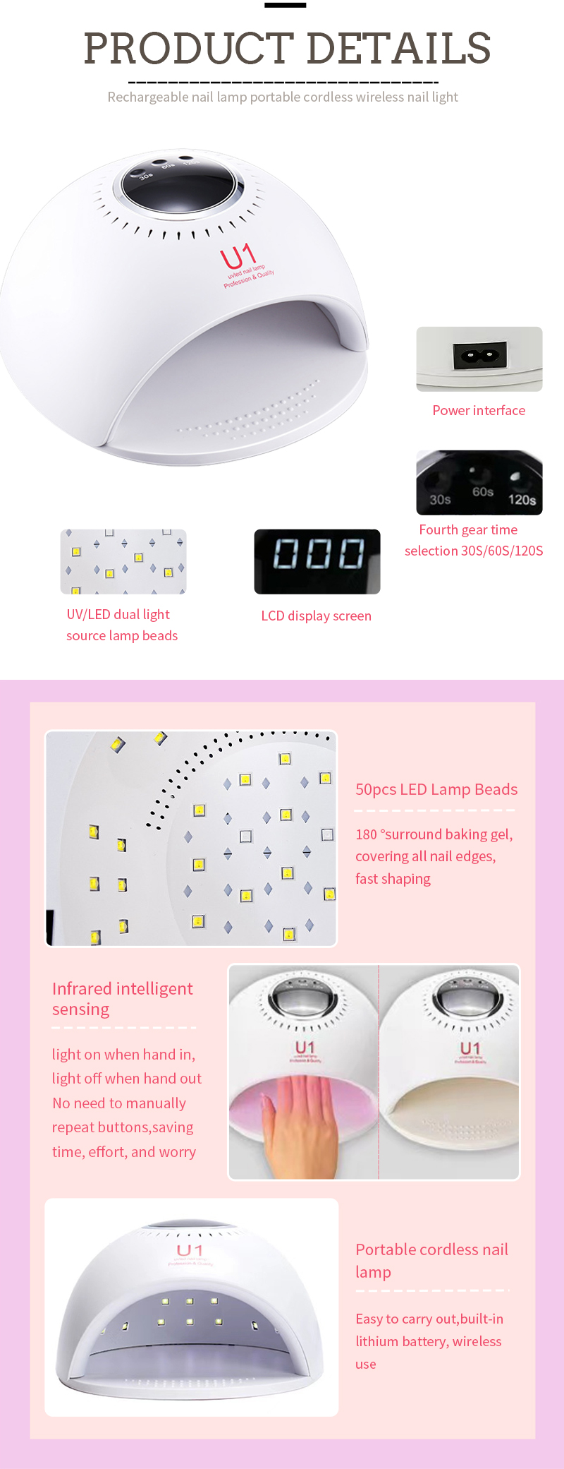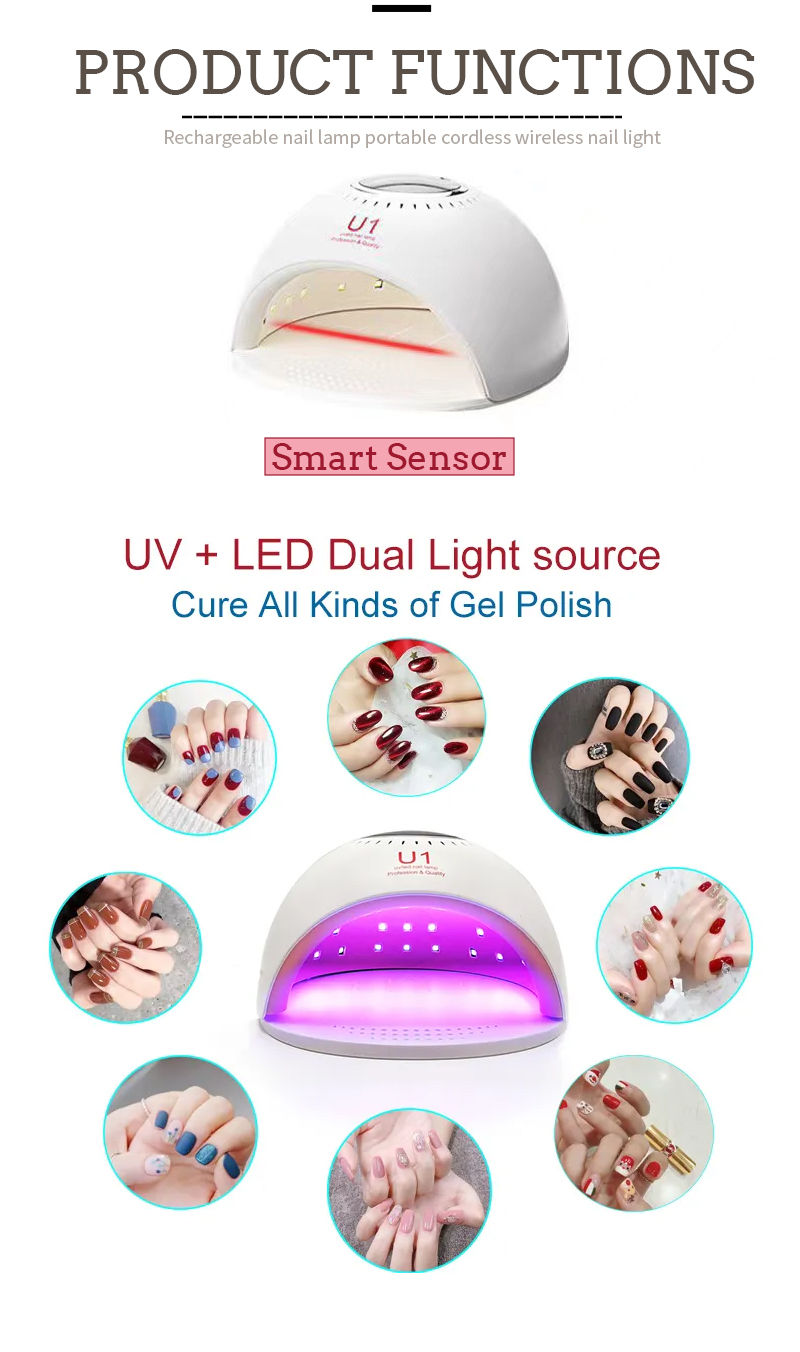 Produsul asigură o uscare uniformă a adezivului fără contracție. Sursele sale de lumină duale asigură o încălzire blândă pentru a preveni decolorarea mâinilor și oboseala ochilor, potrivite atât pentru mâini, cât și pentru picioare, oferind rezultate de uscare remarcabil de rapidă.