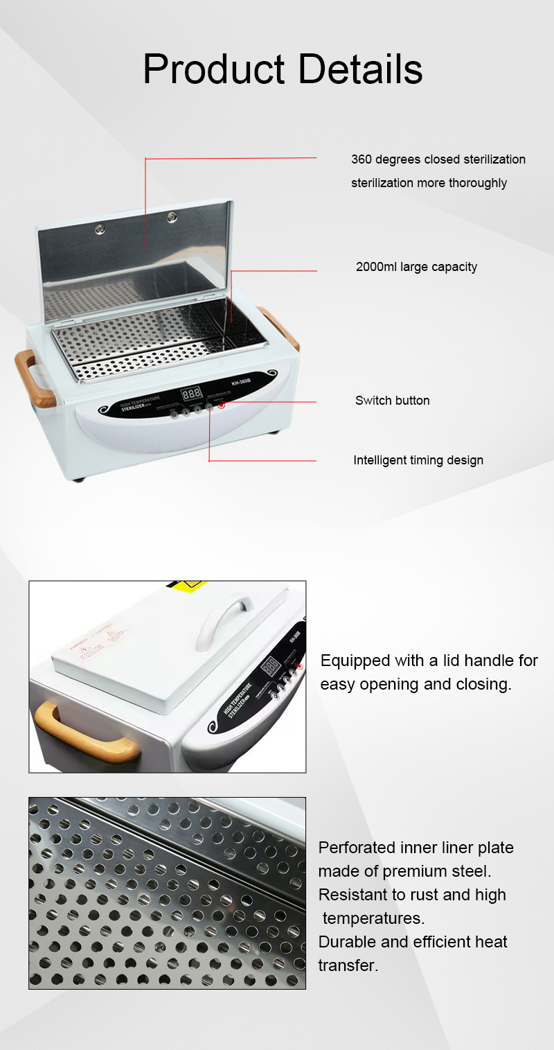 Acest sterilizator generează în primul rând căldură printr-un inel de încălzire, utilizând temperaturi ridicate pentru dezinfecție.