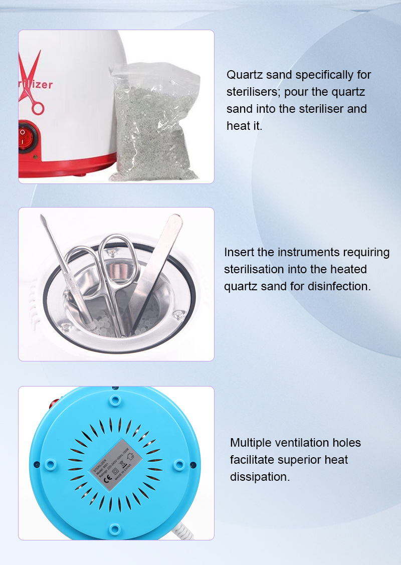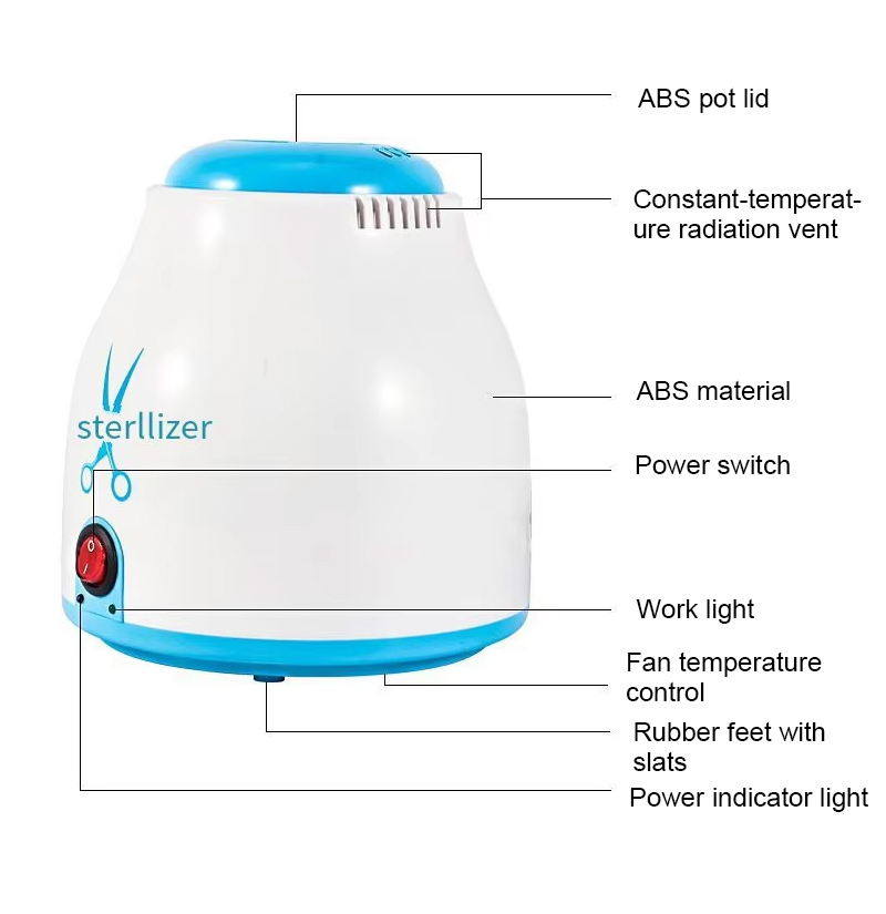 Acest sterilizator generează în primul rând căldură printr-un inel de încălzire, utilizând temperaturi ridicate pentru dezinfecție.