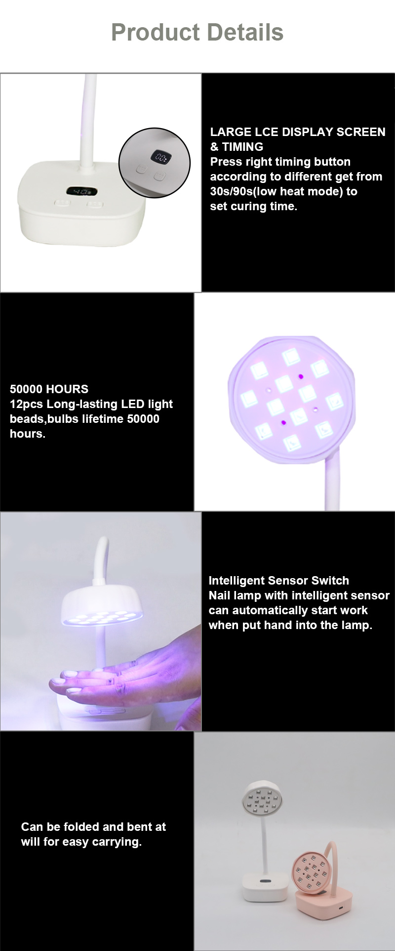 Produsul asigură o uscare uniformă a adezivului fără contracție. Sursele sale de lumină duale asigură o încălzire blândă pentru a preveni decolorarea mâinilor și oboseala ochilor, potrivite atât pentru mâini, cât și pentru picioare, oferind rezultate de uscare remarcabil de rapidă.