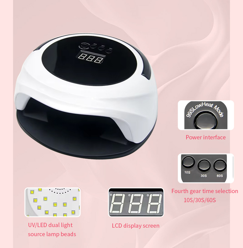 Lampa de uscare a unghiilor cu functie de senzor automat dispune de tehnologia de detectare inteligenta in infrarosu care se lumineaza automat cand mainile se apropie si se stinge cand mainile se indeparteaza, eliminand necazul apasarii repetate a butoanelor si economisind timp si efort. Adezivul de copt de mare putere nu necesită o așteptare îndelungată, economisind atât timp, cât și efort.