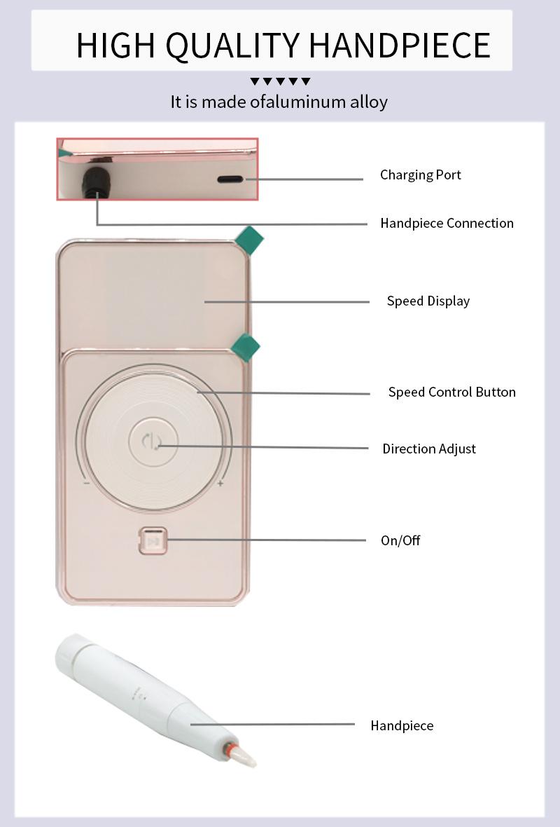 Acest design de afișare a stiloului de șlefuit de mare viteză și zgomot redus, cu soclu pentru stilou de șlefuire, afișaj LCD cu cristale lichide poate afișa numărul de rotații/putere/direcție, butonul comutator de viteză, buton de comutare în sensul acelor de ceasornic/în sens invers acelor de ceasornic, butonul de pauză, motor profesional de 30.000 rpm, cap de șlefuit cu înșurubare.