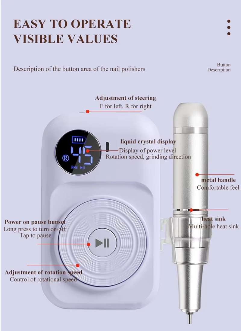 Acest design premium de afișare a stiloului de șlefuit cu zgomot redus, cu soclu pentru stilou de șlefuit, afișaj LCD cu cristale lichide poate afișa numărul de rotații/putere/direcție, buton comutator de viteză, buton de comutare în sensul acelor de ceasornic/în sens invers acelor de ceasornic, buton de pauză, motor profesional de 30.000 rpm, cap de șlefuit cu înșurubare.