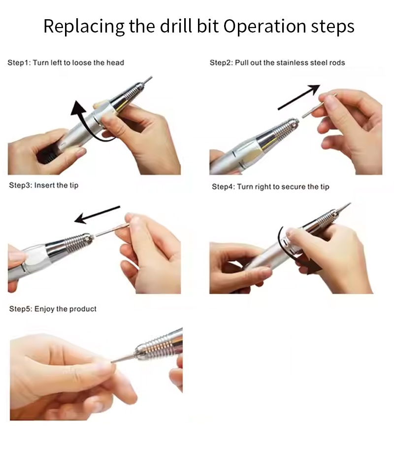 Această mașină portabilă profesională de găurit unghii 35.000 rpm metoda de operare a forajului de înlocuire, adică conectați și scoateți, ușor și convenabil, înlocuirea poate fi folosită după finalizare.