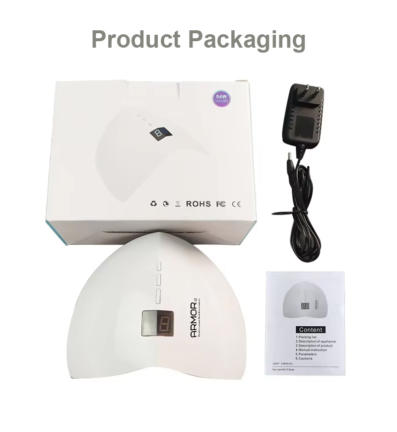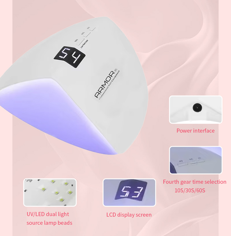 Produsul asigură o uscare uniformă a adezivului fără contracție. Sursele sale de lumină duale asigură o încălzire blândă pentru a preveni decolorarea mâinilor și oboseala ochilor, potrivite atât pentru mâini, cât și pentru picioare, oferind rezultate de uscare remarcabil de rapidă.